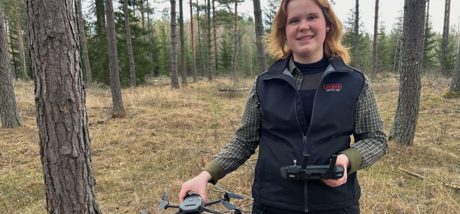 – I mitt sommarjobb fick jag möjlighet att stötta inköparna, och jag insåg tidigt att skogsskötsel var något jag ville fortsätta med, säger Elin. Så när det var dags att läsa vidare ville jag inte släppa jobbet, det var så roligt! Elin blev kvar på JGA, och sedan dess har hennes roll utvecklats. Idag stöttar hon fortsatt inköparna samtidigt som hon arbetar som planläggare och hjälper markägare med framtagning av skogsbruksplaner. Det innebär bland annat att dela in skogen i olika avdelningar och bestånd, att beskriva tillståndet och föreslå lämplig skötsel av skogen. En stor del av arbetet sker ute i fält, ofta med drönare som verktyg.